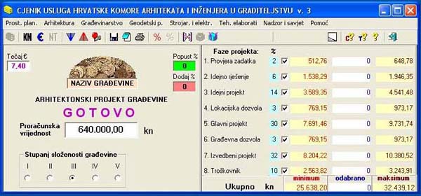 Druga slika - Izračun: Prethodno je odabrana proračunska vrijednost 640.000, nakon toga III stupanj složenosti građevine, iz čega su proizašle cijene po fazama, a ukupna je cca 28.000 kn.